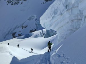 Depuis le Lac des Plagnes, excellente neige, conversions, crampons et piolets nous ont menés jusqu’à la fenêtre d’Ardens par le couloir Nord pour descendre sur le versant Sud dans le creux des Boitons.
