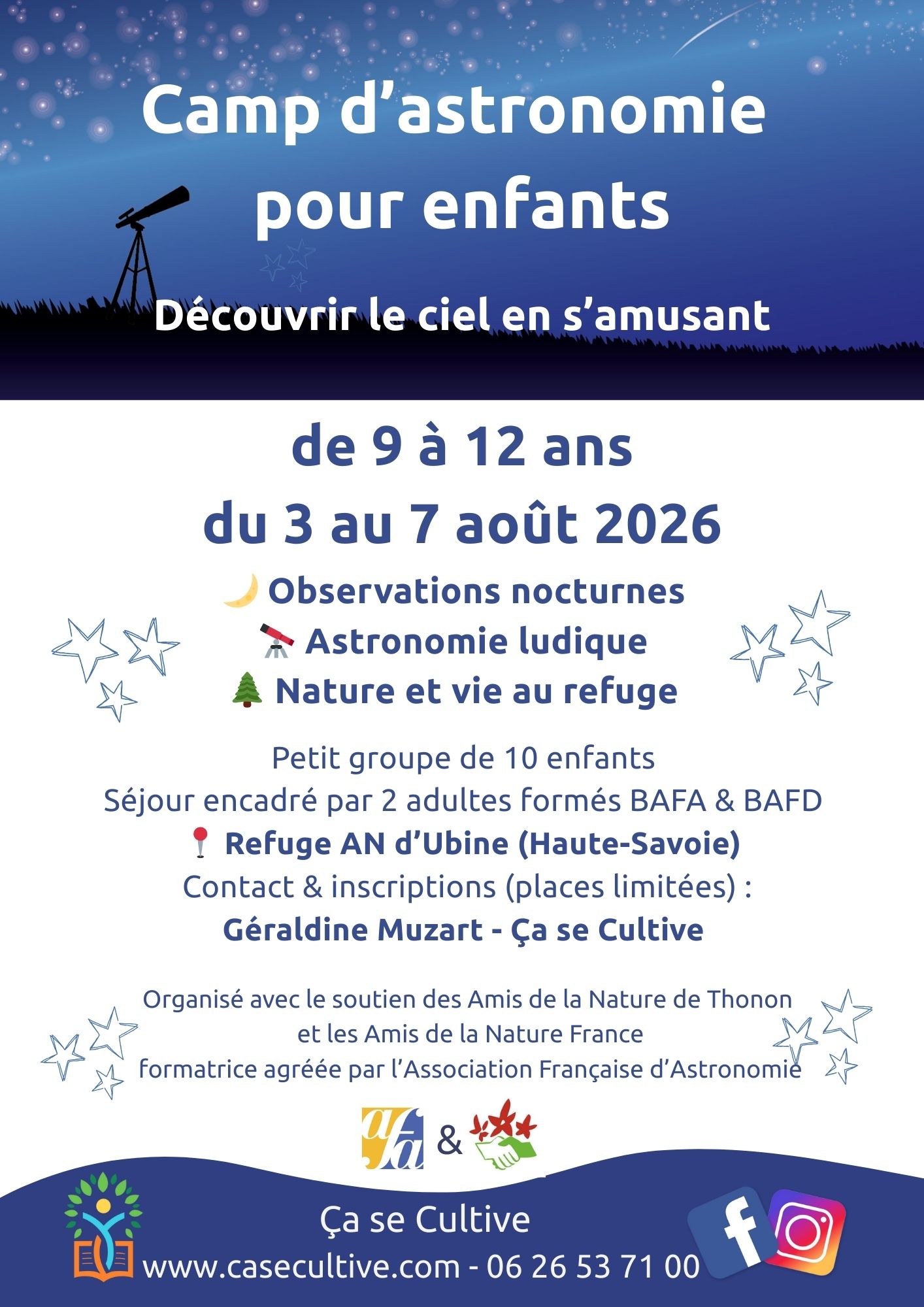 Depuis maintenant 3 ans, le Camp d’astronomie « Petite Ourse » au refuge d’Ubine, organisé en partenariat avec les Amis de la Nature de Thonon, accueille des enfants de 9 à 12 ans pour une semaine unique entre sciences, nature et découverte.
